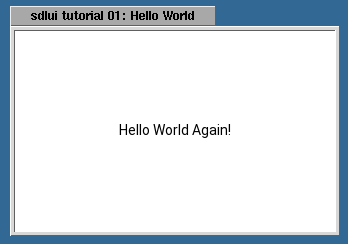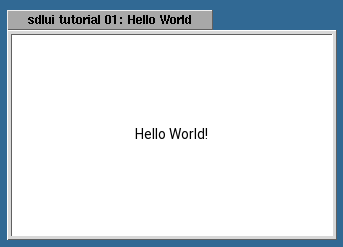 | sdlui_t *sdlui; ... char *p; ... if((sdlui=sdlui_init("sdlui tutorial 01: Hello World",DEFAULTWIDTH,DEFAULTHEIGHT))==NULL) return(1); p=sdlui_add(sdlui,_F,_L,"label:.l","-text \"Hello World!\" -click \"clicked\""); sdlui_pack(sdlui,_F,_L,p,"-side top -fill both -expand true -anchor center");